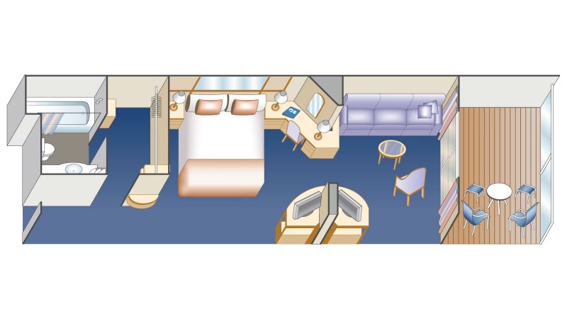 Η μεγάλη σουίτα με μπαλκόνι αποτελείται από την κρεβαττοκάμαρα με ένα υπέρδιπλο κρεβάτι, ευρύχωρο καθιστικό με καναπέ το οποίο γίνεται διπλό κρεβάτι, γραφείο και την τραπεζαρία. Συνολικά τετραγωνικά μέτρα καμπίνας κυμαίνονται απο 43 έως 64 τ.μ.