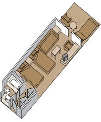 Δύο μονά κρεβάτια που προσαρμόζονται σε ένα διπλό, ευρύχωρο καθιστικό με καναπέ που γίνεται διπλό κρεβάτι, προσωπικό μπαλκόνι, dressing room, bar, ψυγείο και μπάνιο με υδρομασάζ. Συνολικά τετραγωνικά μέτρα καμπίναςαπό 52 έως 59τ.μ.