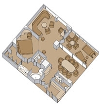 Δύο μονά κρεβάτια που προσαρμόζονται σε ένα διπλό, ευρύχωρο καθιστικό με καναπέ που γίνεται διπλό κρεβάτι, προσωπικό μπαλκόνι, dressing room, bar, ψυγείο και μπάνιο με υδρομασάζ. Συνολικά τετραγωνικά μέτρα καμπίναςαπό 52 έως 59τ.μ.