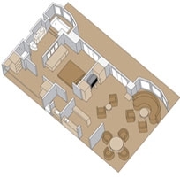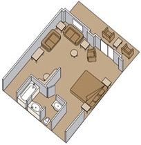 Δύο μονά κρεβάτια που προσαρμόζονται σε ένα διπλό, καθιστικό, προσωπικό μπαλκόνι, ψυγείο, bar και μπάνιο. Συνολικά τετραγωνικά μέτρα καμπίνας από 34 έως 37 τ.μ.