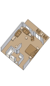 Δύο μονά κρεβάτια που προσαρμόζονται σε ένα διπλό, καθιστικό, προσωπικό μπαλκόνι, ψυγείο, bar και μπάνιο. Συνολικά τετραγωνικά μέτρα καμπίνας από 34 έως 37 τ.μ.