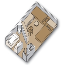 Δύο μονά κρεβάτια που προσαρμόζονται σε ένα διπλό, ευρύχωρο καθιστικό με καναπέ που γίνεται διπλό κρεβάτι, προσωπικό μπαλκόνι, ψυγείο και μπάνιο. Συνολικά τετραγωνικά μέτρα καμπίνας από 20 έως 25 τ.μ.