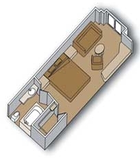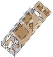 Δύο μονά κρεβάτια που προσαρμόζονται σε ένα διπλό, καθιστικό, προσωπικό μπαλκόνι, ψυγείο, bar και μπάνιο. Συνολικά τετραγωνικά μέτρα καμπίνας από 34 έως 37 τ.μ.