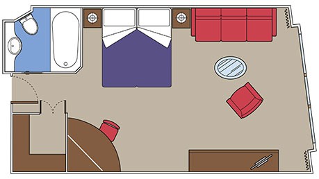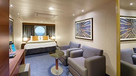 Tα κρεβάτια μπορούν να είναι δύο μονά ή ένα διπλό. Κλιματισμός. Ευρύχωρη ντουλάπα. Μπάνιο με ντους και μπανιέρα. Ξεχωριστός χώρος καθιστικού και τραπεζαρίας. Τηλεόραση. Ίντερνετ(περιλαμβάνεται πακέτο). Τηλέφωνο & χρηματοκιβώτιο. Mini bar & καφετιέρα. Επιφάνεια καμπίνας 58τ.μ. με μεγάλο ιδιωτικό μπλακόνι 36 τ.μ.