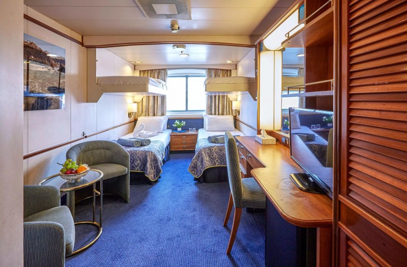 Οι εξωτερικές καμπίνες στο κατάστρωμα 2 (~12 τ.μ.) μπορούν να φιλοξενήσουν μέχρι 4 άτομα, με 2 χαμηλά κρεβάτια, 3ο/4ο κρεβάτι κουκέτα, μπάνιο με ντουζιέρα, κλιματισμό, τηλέφωνο, στεγνωτήρα μαλλιών, θυρίδα ασφαλείας, τηλεόραση και φινιστρίνι. Τα μονά κρεβάτια μπορούν να τοποθετηθούν δίπλα-δίπλα, επικοινωνήστε μαζί μας για περισσότερες πληροφορίες. Το μέγεθος και η διάταξη μπορεί να διαφέρουν στην ίδια κατηγορία καμπίνας.
