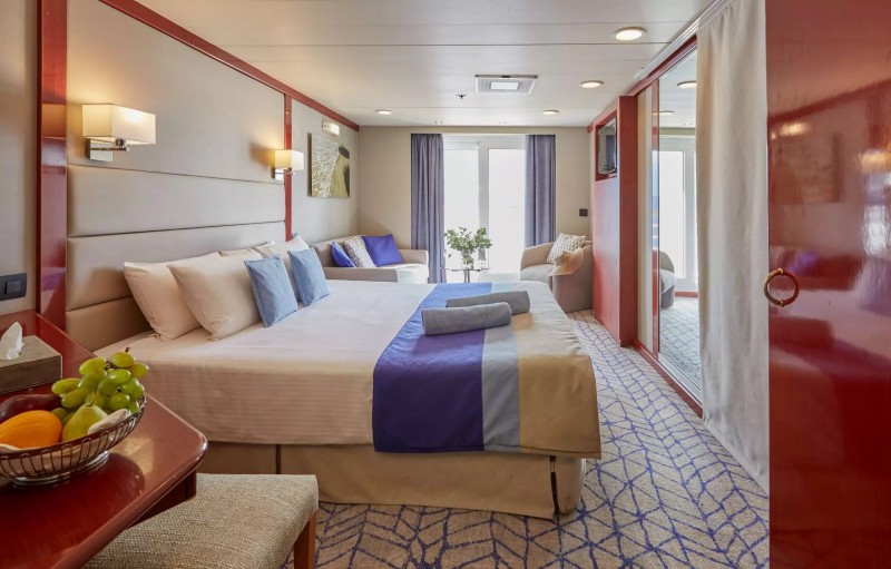 Οι σουίτες με μπαλκόνι στο κατάστρωμα 7 (~36 τ.μ.) μπορούν να φιλοξενήσουν μέχρι 3 άτομα, με 2 χαμηλά κρεβάτια και 1 καναπέ-κρεβάτι, μπάνιο με ντουζιέρα, κλιματισμό, τηλέφωνο, στεγνωτήρα μαλλιών, θυρίδα ασφαλείας, Τηλεόραση και φινιστρίνι στο κατάστρωμα 2 ή παράθυρο στο κατάστρωμα 3.