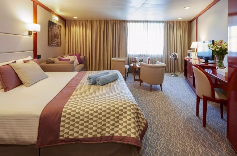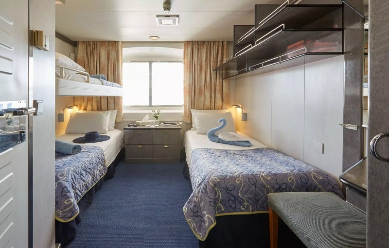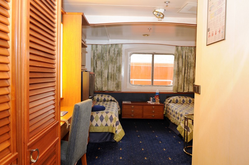 Οι εξωτερικές καμπίνες στο κατάστρωμα 2 (~12 τ.μ.) μπορούν να φιλοξενήσουν μέχρι 4 άτομα, με 2 χαμηλά κρεβάτια, 3ο/4ο κρεβάτι κουκέτα, μπάνιο με ντουζιέρα, κλιματισμό, τηλέφωνο, στεγνωτήρα μαλλιών, θυρίδα ασφαλείας, τηλεόραση και φινιστρίνι. Τα μονά κρεβάτια μπορούν να τοποθετηθούν δίπλα-δίπλα, επικοινωνήστε μαζί μας για περισσότερες πληροφορίες. Το μέγεθος και η διάταξη μπορεί να διαφέρουν στην ίδια κατηγορία καμπίνας.