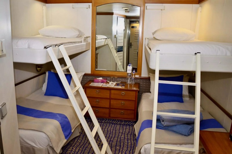 Οι εσωτερικές καμπίνες στο κατάστρωμα 4 και 5 (~12 τ.μ.) μπορούν να φιλοξενήσουν μέχρι 4 άτομα, με 2 χαμηλά κρεβάτια, 3ο/4ο κρεβάτι κουκέτα, μπάνιο με ντουζιέρα, κλιματισμό, τηλέφωνο, στεγνωτήρα μαλλιών, θυρίδα ασφαλείας και τηλεόραση. Τα μονά κρεβάτια μπορούν να τοποθετηθούν δίπλα-δίπλα, επικοινωνήστε μαζί μας για περισσότερες πληροφορίες. Το μέγεθος και η διάταξη μπορεί να διαφέρουν στην ίδια κατηγορία καμπίνας.
