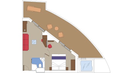 Tα κρεβάτια μπορούν να είναι δύο μονά ή ένα διπλό. Διώροφη. Κλιματισμός. Ευρύχωρη ντουλάπα. Μπάνιο με μπανιέρα. Χώρος Καθιστικού με καναπέ κρεβάτι. Τηλεόραση. Ίντερνετ(περιλαμβάνεται πακέτο). Τηλέφωνο. Mini bar & χρηματοκιβώτιο. Επιφάνεια καμπίνας 59τ.μ. με ιδιωτικό μπλακόνι 23τ.μ. και ιδιωτικό υδρομασάζ