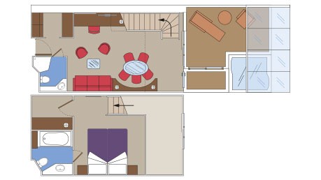 Tα κρεβάτια μπορούν να είναι δύο μονά ή ένα διπλό. Διώροφη. Κλιματισμός. Ευρύχωρη ντουλάπα. Μπάνιο με μπανιέρα. Χώρος Καθιστικού με καναπέ κρεβάτι. Τηλεόραση. Ίντερνετ(περιλαμβάνεται πακέτο). Τηλέφωνο. Mini bar & χρηματοκιβώτιο. Επιφάνεια καμπίνας 59τ.μ. με ιδιωτικό μπλακόνι 23τ.μ. με ιδιωτικό υδρομασάζ