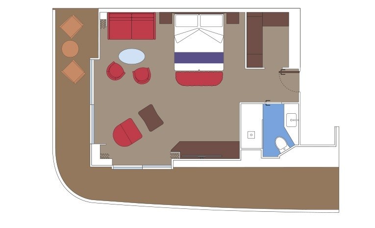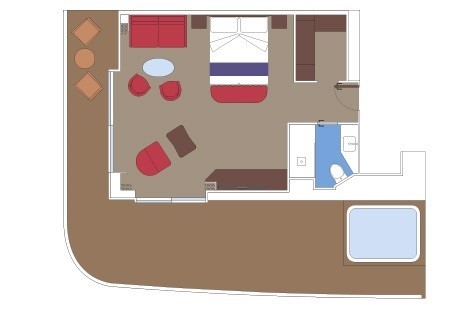 Tα κρεβάτια μπορούν να είναι δύο μονά ή ένα διπλό. Διώροφη. Κλιματισμός. Ευρύχωρη ντουλάπα. Μπάνιο με μπανιέρα. Χώρος Καθιστικού με καναπέ κρεβάτι. Τηλεόραση. Ίντερνετ(περιλαμβάνεται πακέτο). Τηλέφωνο. Mini bar & χρηματοκιβώτιο. Επιφάνεια καμπίνας 59τ.μ. με ιδιωτικό μπλακόνι 23τ.μ. με ιδιωτικό υδρομασάζ