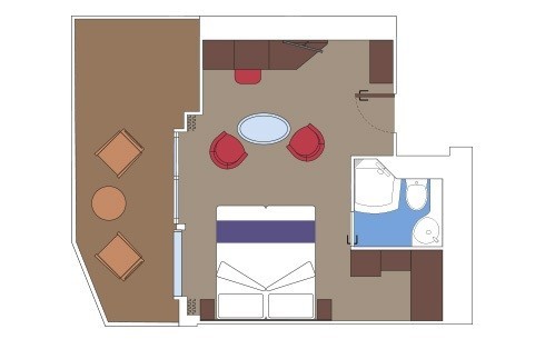 Tα κρεβάτια μπορούν να είναι δύο μονά ή ένα διπλό. . Κλιματισμός. Ευρύχωρη ντουλάπα. Μπάνιο με ντους και μπανιέρα. Ξεχωριστός χώρος καθιστικού και τραπεζαρίας. Τηλεόραση. Ίντερνετ(περιλαμβάνεται πακέτο). Τηλέφωνο & χρηματοκιβώτιο. Mini bar & καφετιέρα. Επιφάνεια καμπίνας 58τ.μ. με μεγάλο ιδιωτικό μπλακόνι 42-51 τ.μ. και ιδιωτικό υδρομασάζ.