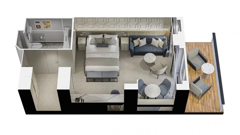Με μέγεθος 22 τ.μ., οι καμπίνες αυτής της κατηγορίας είναι η επιτομή της ευρυχωρίας και της εφευρετικότητας. Λουσμένο σε απαλούς τόνους, το καθένα είναι επιπλωμένο με ένα κρεβάτι queen-size γεμάτο με βελούδινα κλινοσκεπάσματα και παχουλά μαξιλάρια, άνετο καθιστικό, προσεγμένες ανέσεις, άφθονο αποθηκευτικό χώρο και μεγάλο μπάνιο.