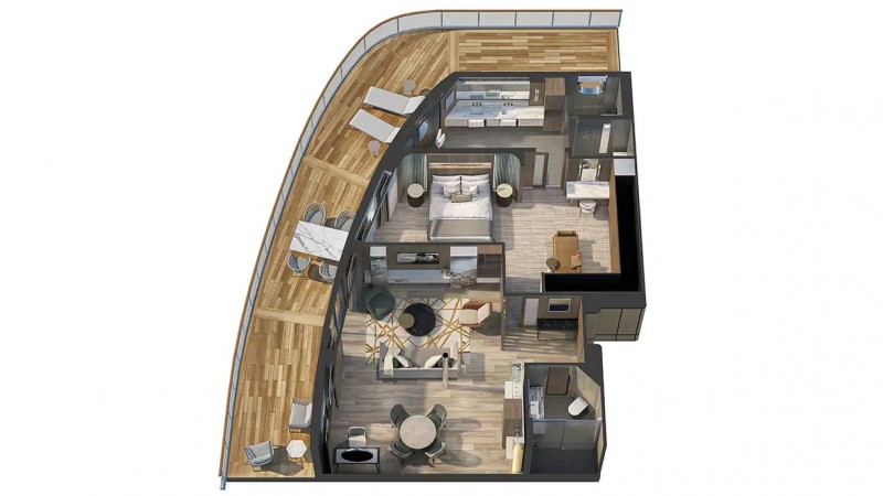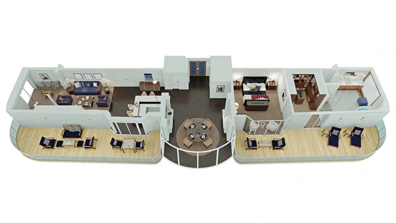 Εκτείνοντας όλη τη δοκό του πλοίου, κάθε μία από τις τρεις Owner's Suites στο Vista έχει περίπου 222+ τ.μ.. Αυτές οι θαλάσσιες σουίτες έχουν στιλ αποκλειστικά στο Ralph Lauren Home σε μια αρμονική συμφωνία με νέες εισαγωγές επίπλων και εμβληματικά κλασικά. Το κεντρικό σημείο εδώ είναι μια κομψή τραπεζαρία στο Brook Street Salon που περιβάλλεται από τις καρέκλες σκηνοθέτη Holbrook από το Ralph Lauren Home, ενώ το διπλανό σαλόνι παρουσιάζει μια συγκρατημένη προσέγγιση στα μοντέρνα έπιπλα με ναυτική όψη και λαμπερές πινελιές. Ένα κομψό κοκτέιλ μπαρ από τριανταφυλλιά και ένας άλλος τοίχος από γυαλί ανοίγει σε μια μεγάλη βεράντα από ξύλο τικ. Το κύριο υπνοδωμάτιο είναι ένα ολόκληρο καταφύγιο, με ένα πολυτελές κρεβάτι king-size, ευρύχωρες ντουλάπες και ένα πολυτελές κύριο μπάνιο με μεγάλη μπανιέρα και ντους με θέα στον ωκεανό. Μια δεύτερη βεράντα από ξύλο τικ έξω από την κύρια κρεβατοκάμαρα υπόσχεται ηρεμία μέσα στην εκλεπτυσμένη κομψότητα.