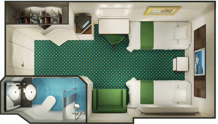 Όλες οι καμπίνες διαθέτουν τηλεόραση, ψυγείο, χρηματοκιβώτιο, μπάνιο με ντους και πιστολάκι μαλλιών. Όλες οι δίκλινες καμπίνες μπορούν να τροποποιηθούν και να έχουν ή δύο μονά κρεβάτια ή ένα διπλό.