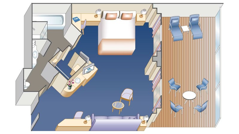 Η μεγάλη σουίτα με μπαλκόνι αποτελείται από την κρεβαττοκάμαρα με ένα υπέρδιπλο κρεβάτι, ευρύχωρο καθιστικό με καναπέ το οποίο γίνεται διπλό κρεβάτι και την τραπεζαρία. Μεγάλο μπαλκόνι, 2 τηλεοράσεις, προσωπικό υπολογιστή, ψυγείο και bar, μεγάλη ντουλάπα και μπάνιο με γωνιακή μπανιέρα και multi-directional brass-fitting ντους. Συνολικά τετραγωνικά μέτρα καμπίνας 68 τ.μ.