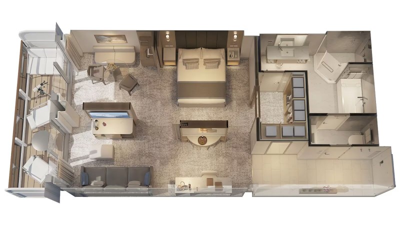 Δύο μονά κρεβάτια, που προσαρμόζονται σε ένα διπλό, καθιστικό με καναπέ και γραφείο, μπαλκόνι, 2 τηλεοράσεις, ψυγείο και μπαρ. Μπάνιο με μπανιέρα και ντους. Πανοραμικη θέα με με ενιαίο μεγάλο μπλακόνι. Συνολικό εμβαδό καμπίνας από 42 τμ και άνω.