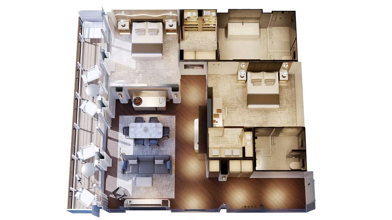 Όλες οι καμπίνες διαθέτουν δύο κρεβάτια τα οποία μετατρέπονται σε ένα διπλό, δορυφορική τηλεόραση, ψυγείο, στεγνωτήρα μαλλιών, χρηματοκιβώτιο, ντουλάπα τηλέφωνο και γραφείο. Αναλόγως της κατηγορίας καμπίνας οι παροχές και οι υπηρεσίες ποικίλουν. Για παράδειγμα οι σουίτες διαθέτουν μια σειρά από ανέσεις και υπηρεσίες όπως ξεχωριστό καθιστικό, καναπέ-κρεβάτι, αναβαθμισμένη έπιπλα βεράντας, δωρεάν μίνι μπαρ, cd / dvd player, δυνατότητα επιλογής μαξιλαριών, πολυτελείς πετσέτες και μπουρνούζια, φρέσκα λουλούδια, αναβαθμισμένες παροχές μπάνιου, ευρύχωρο δωμάτιο ντουλάπα κλπ. Έχετε προτεραιότητα στην διαδικασία επιβίβασης και αποβίβασης, στις κρατήσεις προαιρετικών εκδρομών και στις υπηρεσίες της ρεσεψιόν, δωρεάν υπηρεσία πλυντηρίου, η χρήση spa, αποκλειστική τραπεζαρία για το πρωϊνό και γεύμα, τσάι στην σουίτα σας κλπ. Άπειρες υπηρεσίες για γαστρονομικές ευχαριστήσεις καθώς και ειδικές παροχές που κάνουν τις ημέρες και νύχτες σας εν πλώ αξέχαστες.